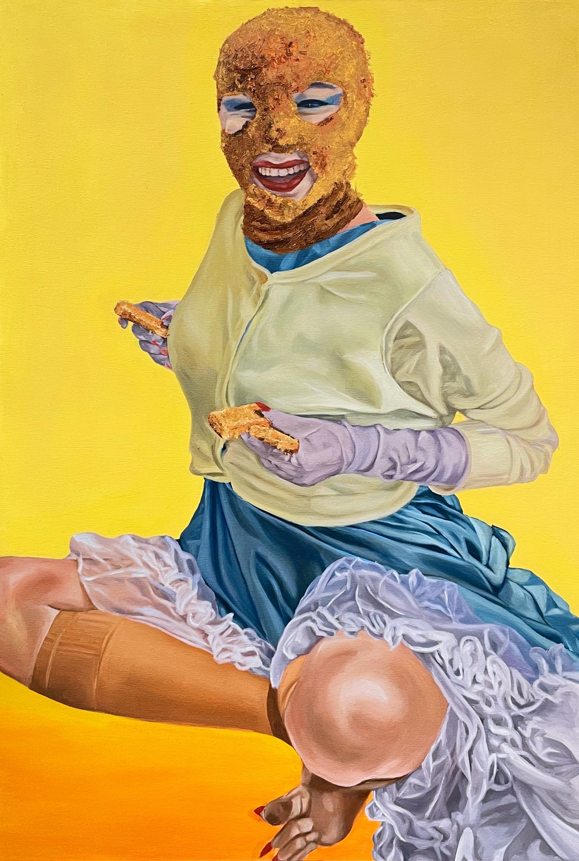 'The subject is wearing a very feminine and frilly glamourous dress, yet her face is obscured by a rough textured gimp mask made of breadcrumbs. This contrast suggests a critique of the way society idealizes celebrities whilst also consuming and discarding them. The mask symbolizes her loss of individuality in the pursuit of fame. The subjects' posture- posed yet awkward- echoes the themes of discomfort beneath the performance. She is posed placing fish finger props against her nipples in a comical action, sexualizing herself like many woman in the spotlight feel forced to do. FISH FINGER TITS is worshiped and consumed.'